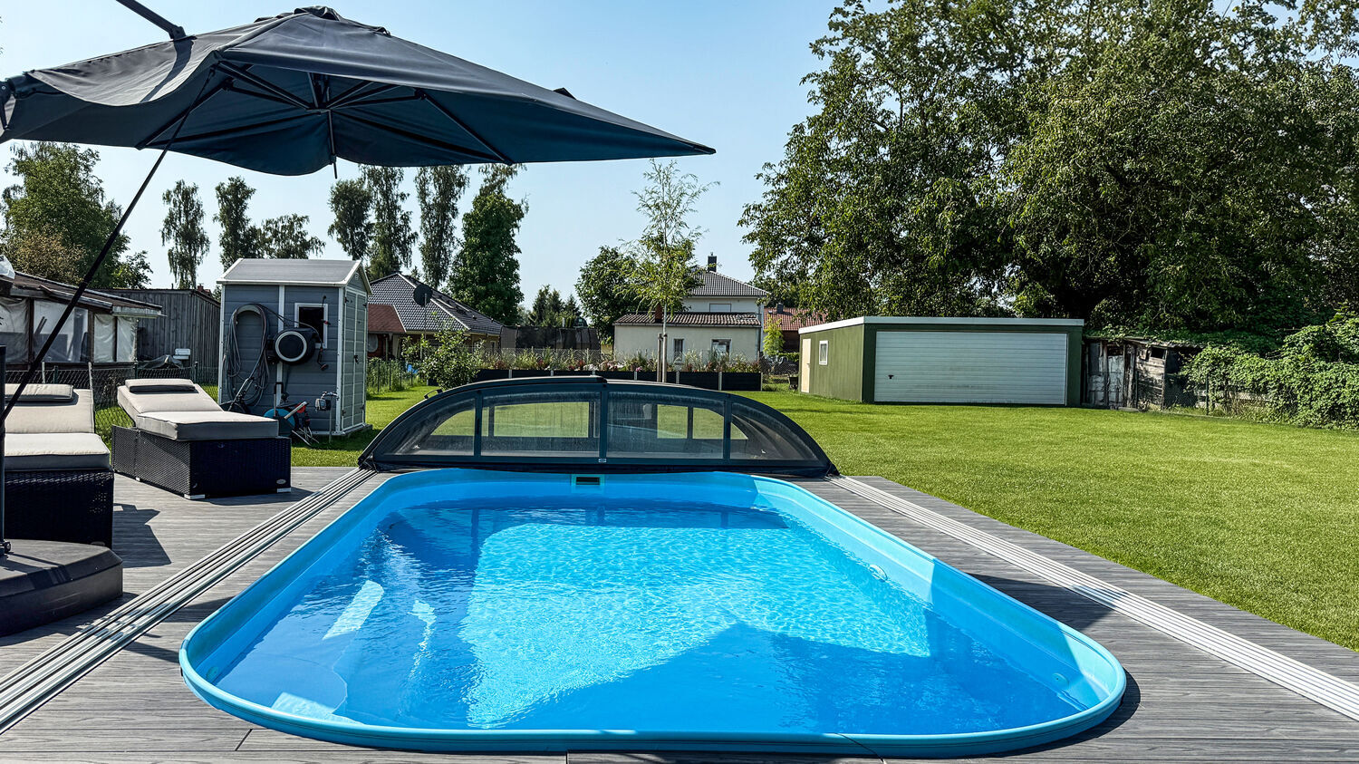 Auf dem Gartengrundstück befinden sich ein Doppelcarport mit Wallbox, eine großzügige überdachte Terrasse mit ca. 50 m² Nutzfläche, ein überdachter Swimmingpool, ein kleines Gartenhaus sowie eine geräumige Garage. Die Garage befindet sich im hinteren Teil des Grundstücks und wird aktuell als Abstellfläche genutzt.
