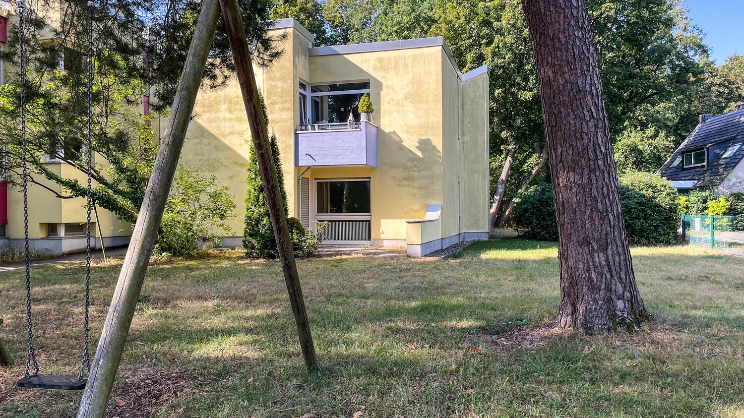 Die ruhige Straße, in der sich das Wohnensemble befindet, erstreckt sich durch ein gepflegtes Wohngebiet, das von Einfamilienhäusern, eleganten und herrschaftlichen Villen mit großzügigen Gärten dominiert wird. Die Straße ist von alten Baumbeständen gesäumt, die im Sommer wohltuenden Schatten spenden und eine angenehme Wohnatmosphäre schaffen. Der Charakter der Gegend ist ruhig und familienfreundlich, mit wenig Verkehr und einer starken Ausrichtung hin zur Natur.