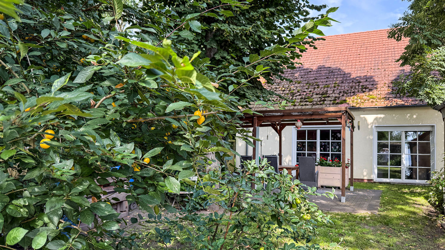 Auf dem idyllischen Gartengrundstück befindet sich eine ca. 8 m² große und überdachte Terrasse. Vor dem Hauseingang befinden sich eine weitere Terrasse sowie ein elektrischer Treppenlift für die Bewohner. Weiterhin befinden sich vor dem Gebäude acht schön angelegte Pkw-Parkplätze. Das Landgut Stober ist fußläufig zu erreichen.