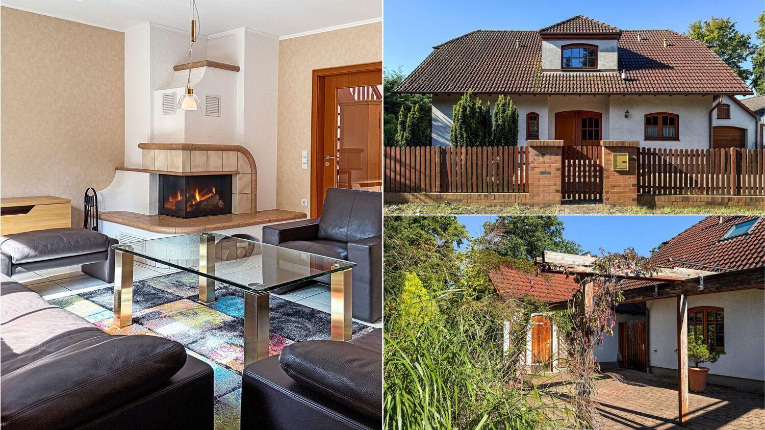 Im Erdgeschoss befinden sich ein großes und lichtdurchflutetes Wohn- und Esszimmer mit schönem Erker, dekorativem Kachelkamin und Zugang zur Terrasse, zwei weitere Zimmer, eine zum Wohnbereich offene Küche mit Einbauküche und separatem Vorratsraum, ein Badezimmer mit Badewanne und Dusche, ein Gäste-WC, ein Flur sowie eine große Hauseingangsdiele. In der Diele führt eine Massivholztreppe in das Dachgeschoss und in den Vollkeller. Die Wohnfläche im Erdgeschoss beträgt ca. 100 m².