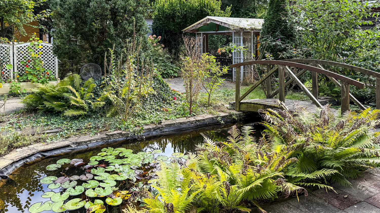 Im hinteren Teil des Grundstücks befindet sich ein massiv gebautes und mit Kohleofen und elektrisch beheizbares Gartenhaus mit zwei bewohnbaren Räumen, einem Wintergarten, einer kleinen Küche, einem Duschbad sowie einem Flur. Die Nutzfläche im Gartenhaus beträgt ca. 35 m².