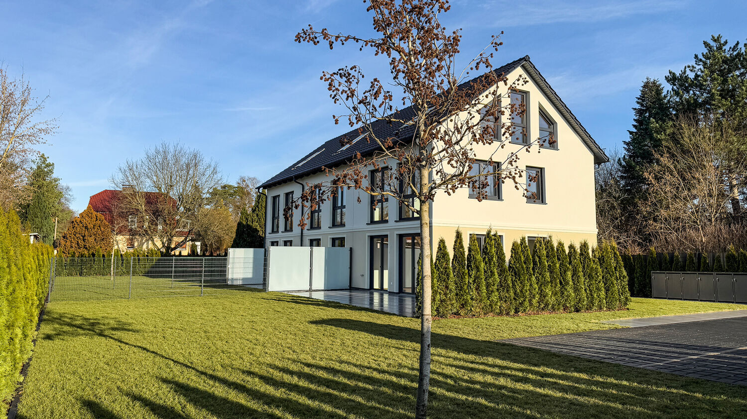 Das moderne Reihenhaus befindet sich in einer begehrten Wohnlage nur wenige Gehminuten von der Reit- und Poloanlage Falkensee-Finkenkrug entfernt. Es wurde im 2025 in moderner Architektur und grundsolider Massivbauweise errichtet.
