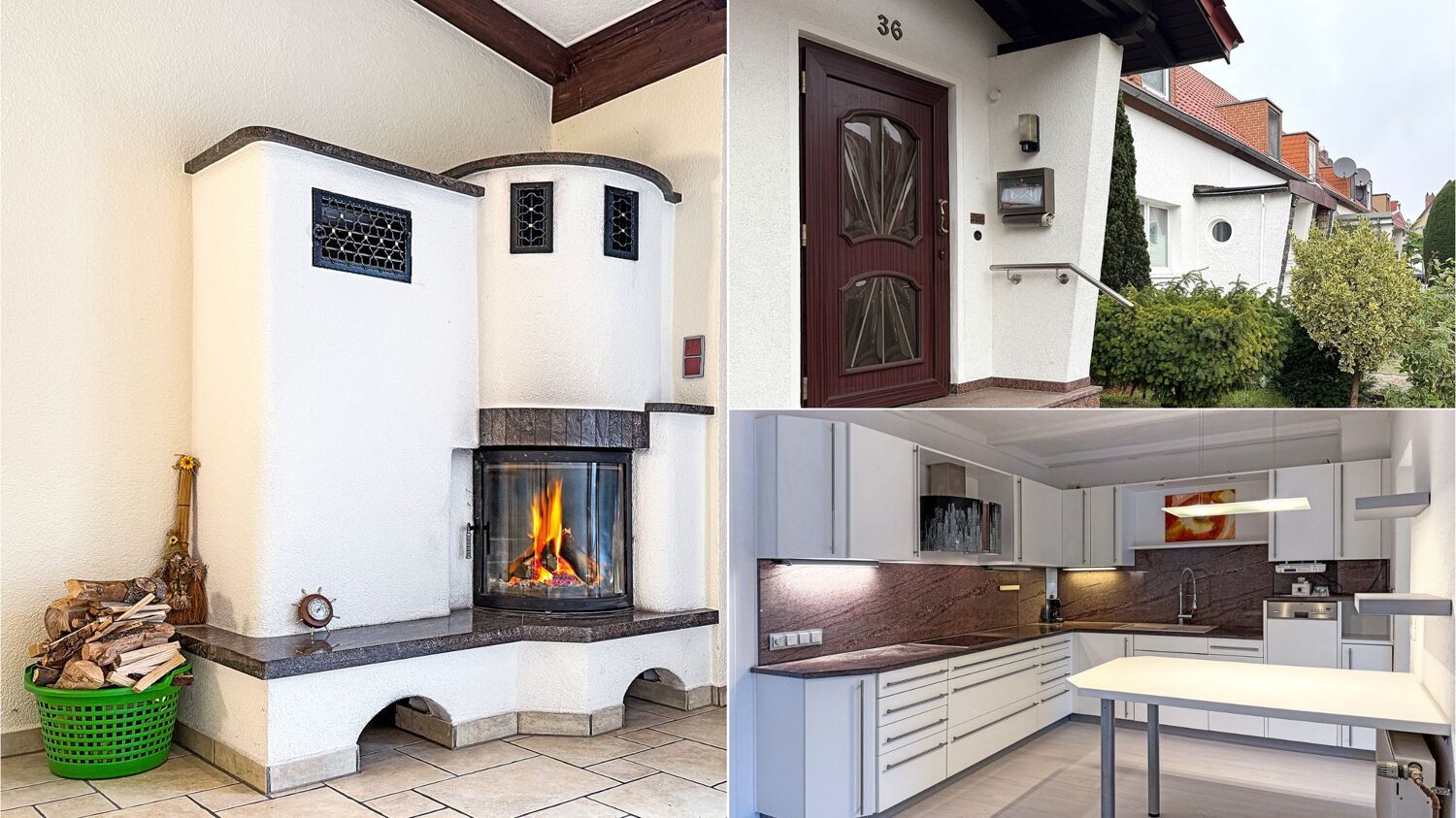 Im Erdgeschoss befinden sich ein Wohnzimmer mit dekorativem Kamin und Zugang zur Westterrasse, ein großes Esszimmer, eine moderne Küche mit Einbauküche sowie ein Flur. Im Flur führt eine Holztreppe in das Dachgeschoss und im Esszimmer in den Vollkeller. Die Wohnfläche im Erdgeschoss beträgt ca. 58 m².