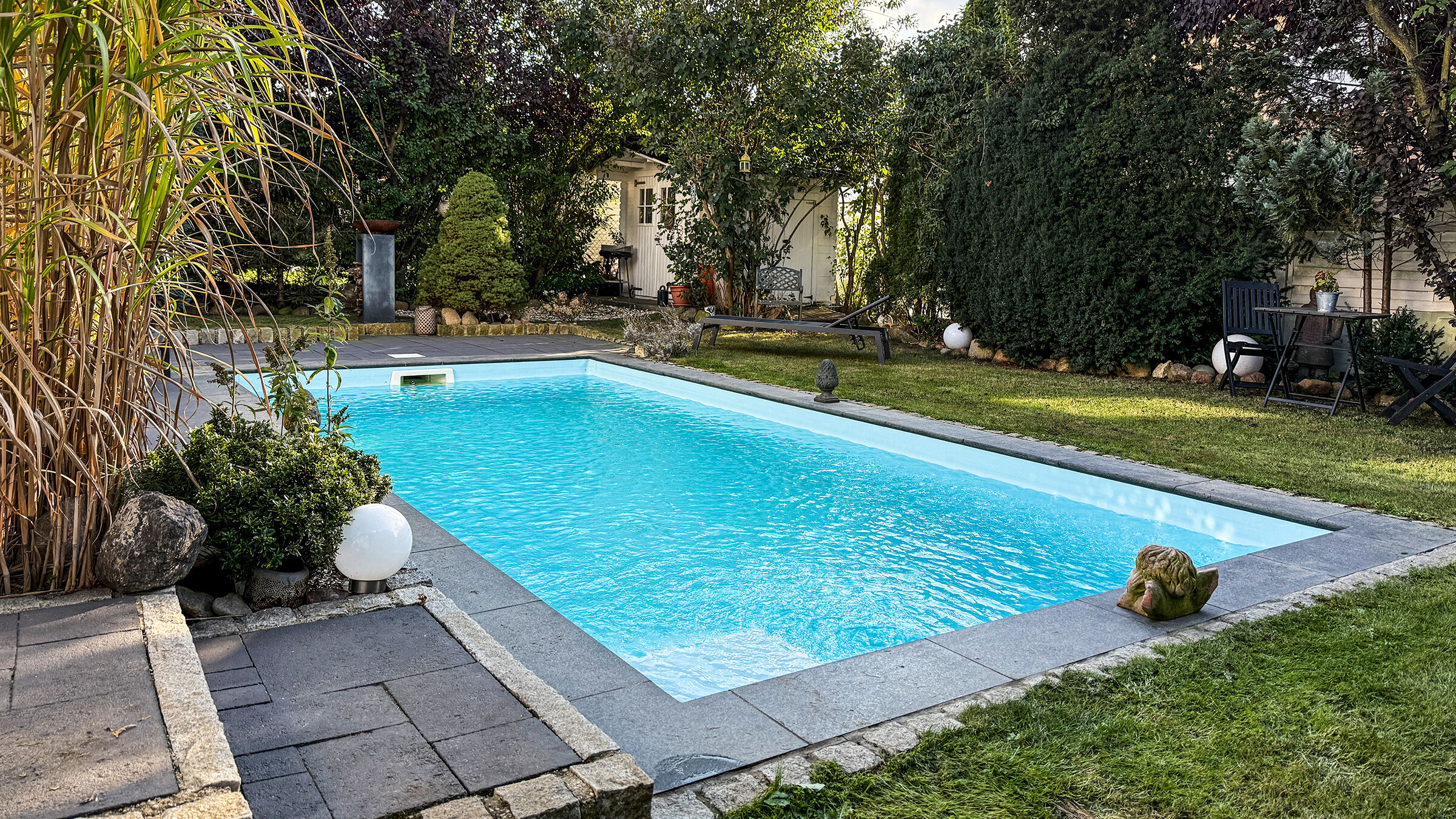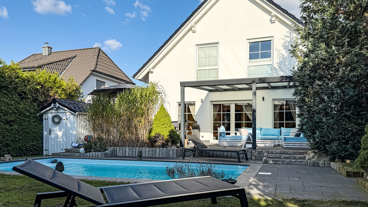Auf dem sonnigen und praktisch angelegten Gartengrundstück befinden sich eine große nach Süd-Westen ausgerichtete und überdachte Terrasse, ein einladender Pool, ein Carport, ein Gartenhaus sowie ein Pumpenhaus. Die Nutzfläche im Gartenhaus beträgt ca. 10 m². Die Nutzfläche im Pumpenhaus beträgt ca. 5 m².