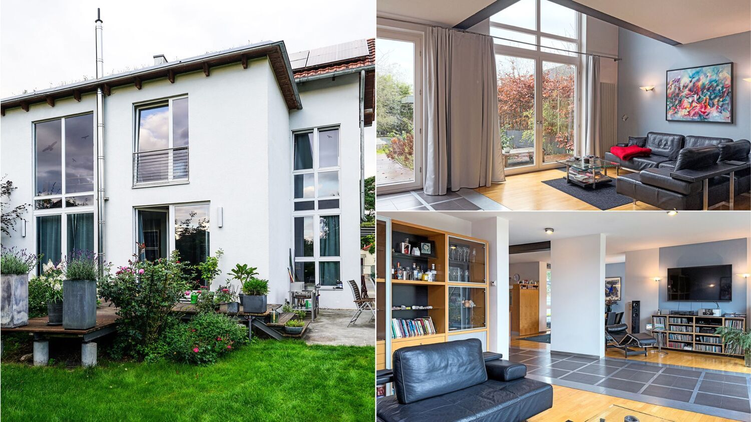Es handelt sich um eine in moderner Architektur und klaren Linien gebaute Doppelhaushälfte mit begrüntem Flachdach, einem Carport und einem Koiteich mit kleinem Wasserfall.