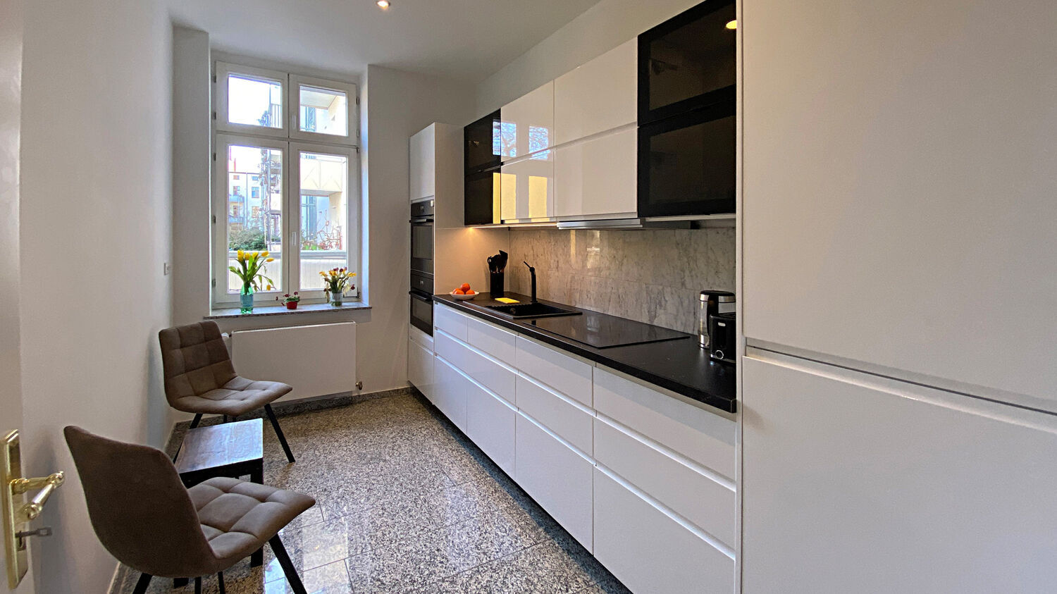Die Wohnung teilt sich auf in ein großes Wohnzimmer, ein weiteres geräumiges Zimmer, eine Küche mit hochwertiger Einbauküche, ein tagesbelichtetes Bad mit bodengleicher Dusche, einem Marmor-Doppelwaschtisch sowie einem Handtuchheizkörper, einen Abstellraum mit der Heiztechnik sowie einen Flur. Die Zimmer sind mit hochwertigem Parkett ausgelegt. Das Badezimmer, die Küche sowie der Flur sind mit eleganten Granit-Fliesen ausgestattet. Die Wohnfläche der Wohnung beträgt ca. 60 m².