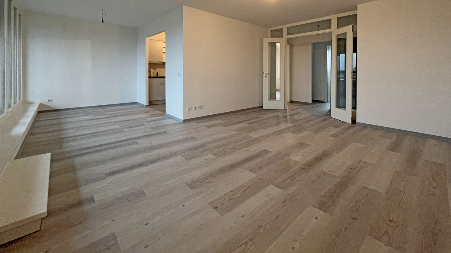 Sie teilt sich auf in ein großes Wohn- und Esszimmer mit Zugang zur Loggia, ein weiteres Zimmer, eine offene Küche mit Einbauküche, ein Badezimmer mit Badewanne und Zugang zum Balkon sowie ein Flur mit praktischer Abstell- und Garderobennische.